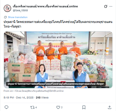 ปทุมธานี วัดพระธรรมกายส่งเครื่องอุปโภคบริโภคช่วยผู้ได้รับผลกระทบเหตุชายแดนไทย–กัมพูชา