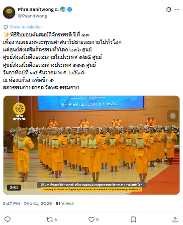 สมเด็จพระสังฆราช ประทานไฟพระฤกษ์และน้ำพระพุทธมนต์ ให้สำนักงานพระพุทธศาสนาแห่งชาติ เชิญไปในพิธีสวดมนต์และปฏิบัติธรรมข้ามปี บริสุทธิ์ด้วยใจ ถวายพระราชกุศล พุทธศักราช 2569 ณ พุทธมณฑล และวัดศูนย์กลางการจัดกิจกรรมทุกจังหวัดทั่วประเทศ