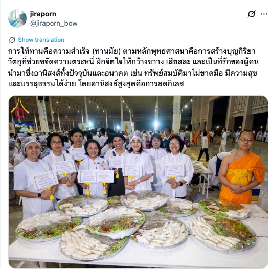 การให้ทานคือความสำเร็จ (ทานมัย) ตามหลักพุทธศาสนาคือการสร้างบุญกิริยาวัตถุที่ช่วยขจัดความตระหนี่ ฝึกจิตใจให้กว้างขวาง เสียสละ และเป็นที่รักของผู้คน