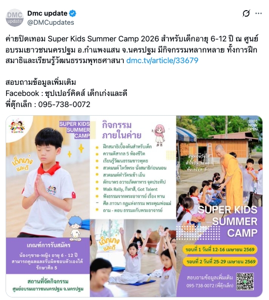 ค่ายปิดเทอม Super Kids Summer Camp 2026 สำหรับเด็กอายุ 6-12 ปี ณ ศูนย์อบรมเยาวชนนครปฐม อ.กำแพงแสน จ.นครปฐม มีกิจกรรมหลากหลาย ทั้งการฝึกสมาธิและเรียนรู้วัฒนธรรมพุทธศาสนา