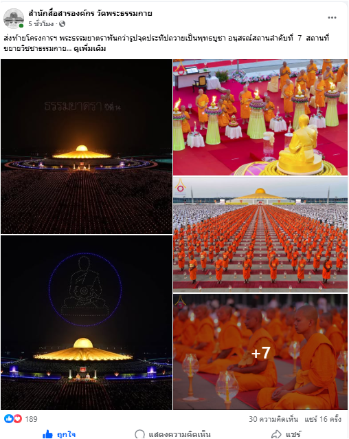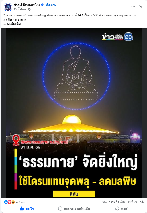 วัดพระธรรมกาย จัดงานยิ่งใหญ่ ปิดท้ายธรรมยาตรา ปีที่ 14 ใช้โดรน 500 ลำ แทนการจุดพลุ ลดการก่อมลพิษทางอากาศ