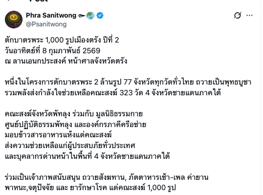 ตักบาตรพระ 1,000 รูปเมืองตรัง ปีที่ 2 วันอาทิตย์ที่ 8 กุมภาพันธ์ 2569 ณ ลานเอนกประสงค์ หน้าศาลจังหวัดตรัง