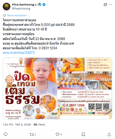 โครงการบรรพชาสามเณร ฟื้นฟูพระพุทธศาสนาทั่วไทย 5,000 รูป ประจำปี 2569