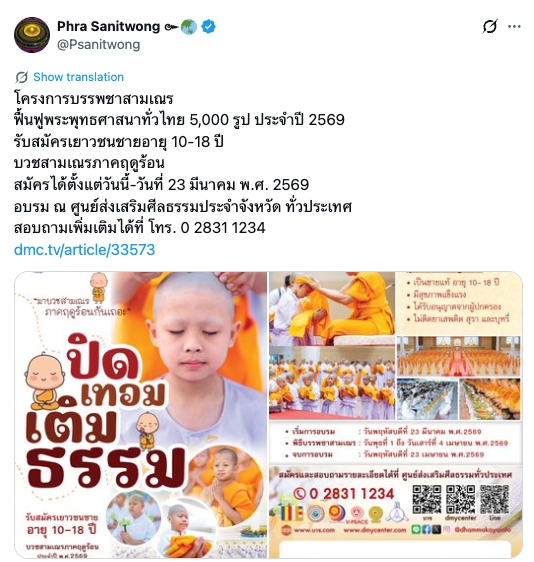 โครงการบรรพชาสามเณร ฟื้นฟูพระพุทธศาสนาทั่วไทย 5,000 รูป ประจำปี 2569 สมัครได้ตั้งแต่วันนี้-วันที่ 23 มีนาคม พ.ศ. 2569 อบรม ณ ศูนย์ส่งเสริมศีลธรรมประจำจังหวัด ทั่วประเทศ