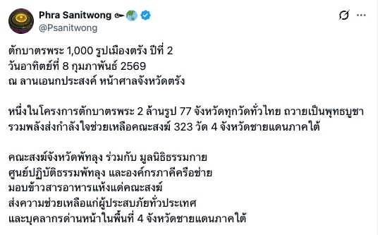 ตักบาตรพระ 1,000 รูปเมืองตรัง ปีที่ 2 วันอาทิตย์ที่ 8 กุมภาพันธ์ 2569 ณ ลานเอนกประสงค์ หน้าศาลจังหวัดตรัง