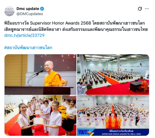 พิธีมอบรางวัล Supervisor Honor Awards 2568 โดยสถาบันพัฒนาเยาวชนโลก เชิดชูคณาจารย์และนิสิตจิตอาสา ส่งเสริมธรรมะและพัฒนาคุณธรรมในเยาวชนไทย