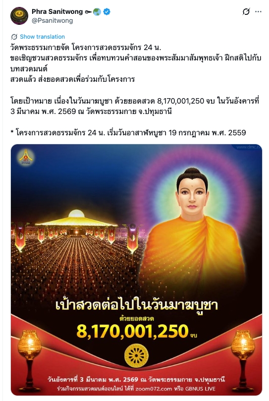วัดพระธรรมกายจัด โครงการสวดธรรมจักร 24 น. ขอเชิญชวนสวดธรรมจักร เพื่อทบทวนคำสอนของพระสัมมาสัมพุทธเจ้า ฝึกสติไปกับบทสวดมนต์