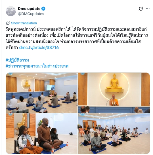 วัดพุทธเคปทาวน์ ประเทศแอฟริกาใต้ ได้จัดกิจกรรมปฏิบัติธรรมและสอนสมาธิแก่ชาวท้องถิ่นอย่างต่อเนื่อง