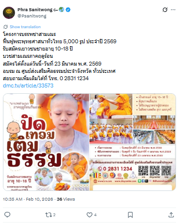 โครงการบรรพชาสามเณร ฟื้นฟูพระพุทธศาสนาทั่วไทย 5,000 รูป ประจำปี 2569