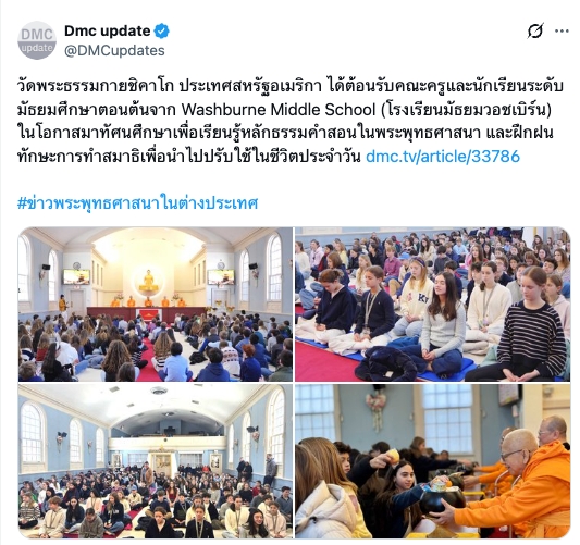 วัดพระธรรมกายชิคาโก ได้ต้อนรับคณะครูและนักเรียนระดับมัธยมศึกษาตอนต้นจาก โรงเรียนมัธยมวอชเบิร์น ในโอกาสมาทัศนศึกษาเพื่อเรียนรู้หลักธรรมคำสอนในพระพุทธศาสนา และฝึกสมาธิ