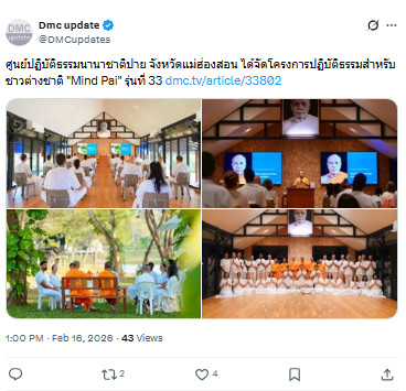 ศูนย์ปฏิบัติธรรมนานาชาติปาย จังหวัดแม่ฮ่องสอน ได้จัดโครงการปฏิบัติธรรมสำหรับชาวต่างชาติ Mind Pai รุ่นที่ 33