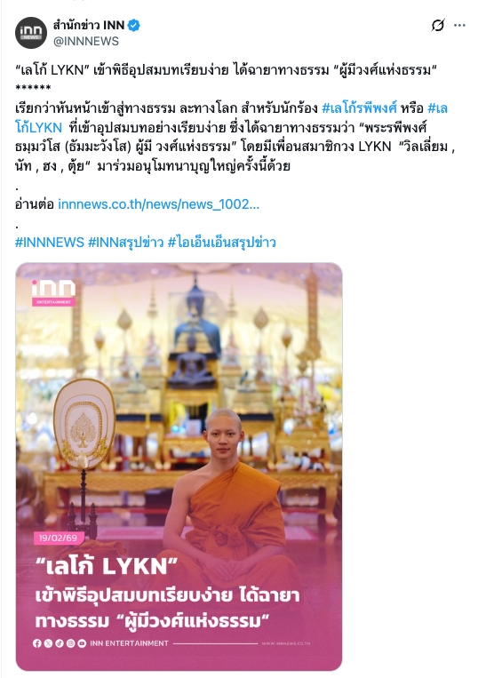 เลโก้ LYKN เข้าพิธีอุปสมบทเรียบง่าย ได้ฉายาทางธรรมผู้มีวงศ์แห่งธรรม