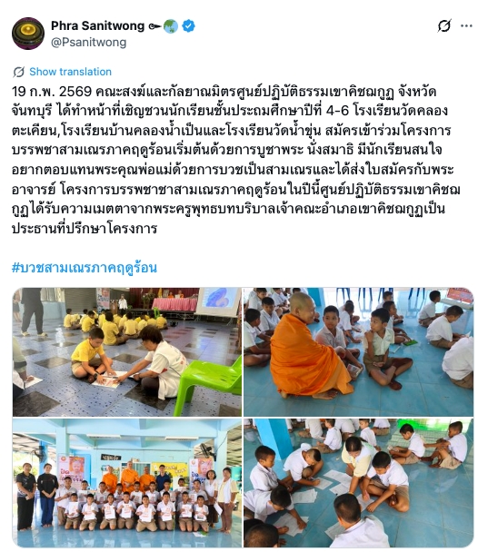 คณะสงฆ์ศูนย์ปฏิบัติธรรมเขาคิชฌกูฏ เชิญชวนนักเรียนชั้นประถมศึกษาปีที่ 4-6 ตอบแทนพระคุณพ่อแม่ด้วยการบวชเป็นสามเณร