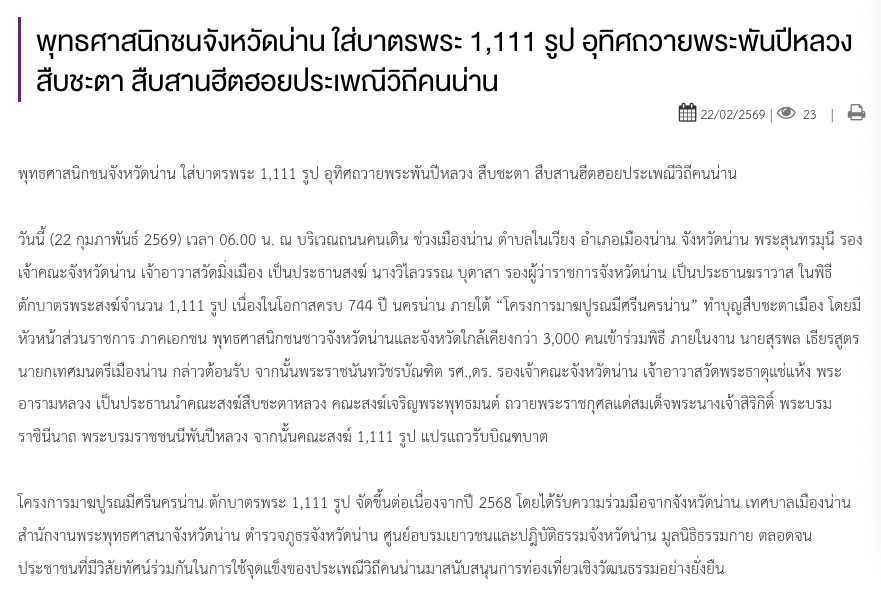 พุทธศาสนิกชนจังหวัดน่าน ใส่บาตรพระ 1,111 รูป อุทิศถวายพระพันปีหลวง สืบชะตา สืบสานฮีตฮอยประเพณีวิถีคนน่าน