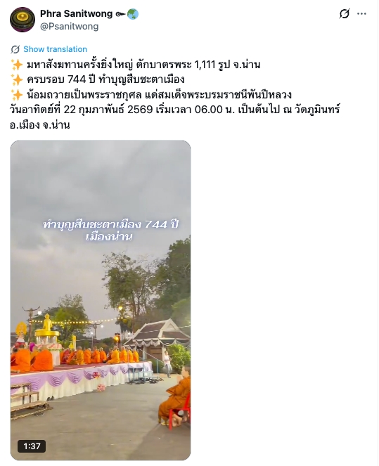 มหาสังฆทานครั้งยิ่งใหญ่ ตักบาตรพระ 1,111 รูป จ.น่าน