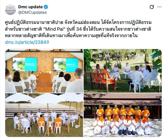 ศูนย์ปฏิบัติธรรมนานาชาติปาย จังหวัดแม่ฮ่องสอน ได้จัดโครงการปฏิบัติธรรมสำหรับชาวต่างชาติ Mind Pai รุ่นที่ 34