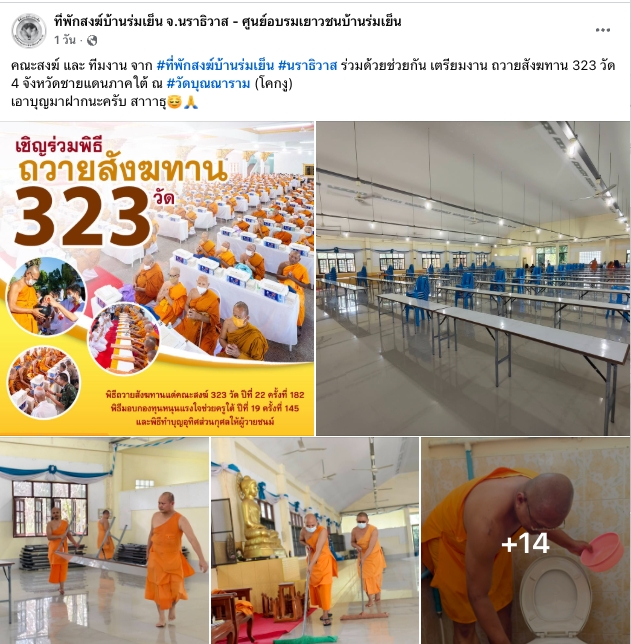 คณะสงฆ์ และ ทีมงาน จาก ที่พักสงฆ์บ้านร่มเย็น นราธิวาส ร่วมด้วยช่วยกัน เตรียมงาน ถวายสังฆทาน 323 วัด 4 จังหวัดชายแดนภาคใต้ ณ วัดบุณณาราม (โคกงู)