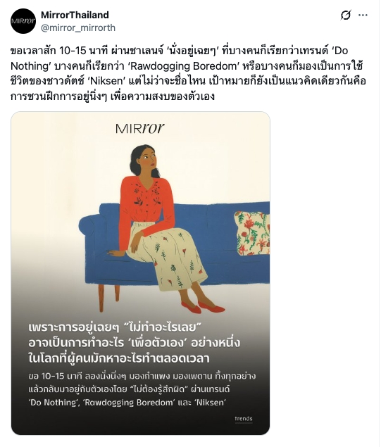 ขอเวลาสัก 10-15 นาที ผ่านชาเลนจ์ นั่งอยู่เฉยๆ เทรนด์ Do Nothing ฝึกการอยู่นิ่งๆ เพื่อความสงบของตัวเอง