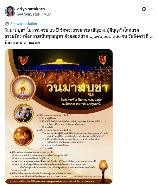 วันมาฆบูชา ในวาระครบ ๕๖ ปี วัดพระธรรมกาย เชิญชวนผู้มีบุญทั่วโลกสวดธรรมจักร เพื่อถวายเป็นพุทธบูชา