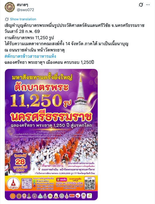 เชิญทำบุญตักบาตรพระหมื่นรูปประวัติศาสตร์ดินแดนศรีวิชัย จ.นครศรีธรรมราช วันเสาร์ 28 ก.พ. 69