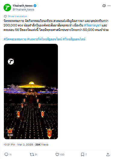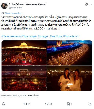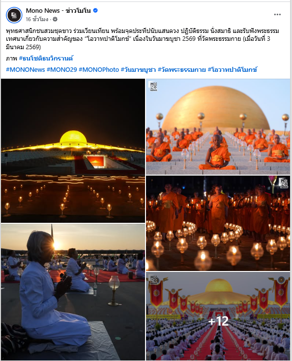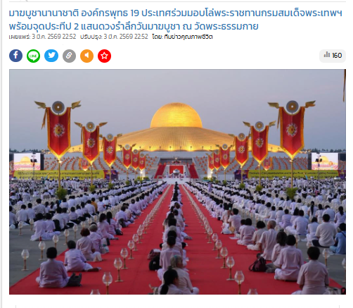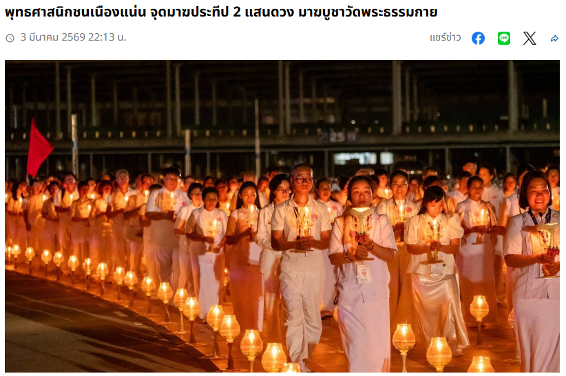 วัดพระธรรมกาย จัดกิจกรรมวันมาฆบูชา รักษาศีล ปฏิบัติธรรม พิธีจุดมาฆประทีปกว่า 2 แสนดวง มีผู้แทนจากองค์กรพุทธ 19 ประเทศเข้าร่วมงาน