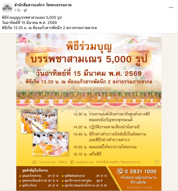 พิธีร่วมบุญบรรพชาสามเณร 5,000 รูป วันอาทิตย์ที่ 15 มีนาคม พ.ศ. 2569 พิธีเริ่ม 13.30 น. ณ ห้องแก้วสารพัดนึก 2 สภาธรรมกายสากล