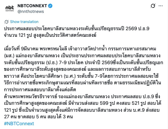 ประกาศผลสอบประโยคบาลีสนามหลวงระดับชั้นเปรียญธรรม ปี 2569 ป.ธ.9 จำนวน 121 รูป สูงสุดเป็นประวัติศาสตร์คณะสงฆ์ไทย