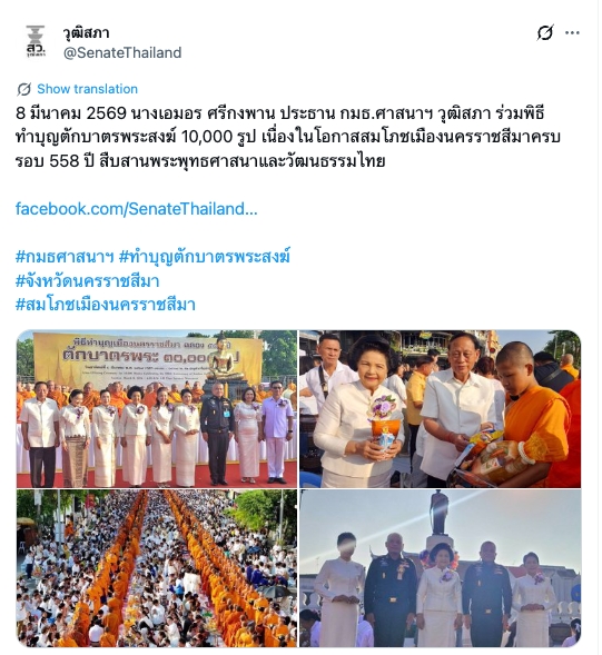 ประธาน กมธ.ศาสนาฯ วุฒิสภา ร่วมพิธีทำบุญตักบาตรพระสงฆ์ 10,000 รูป เนื่องในโอกาสสมโภชเมืองนครราชสีมาครบรอบ 558 ปี