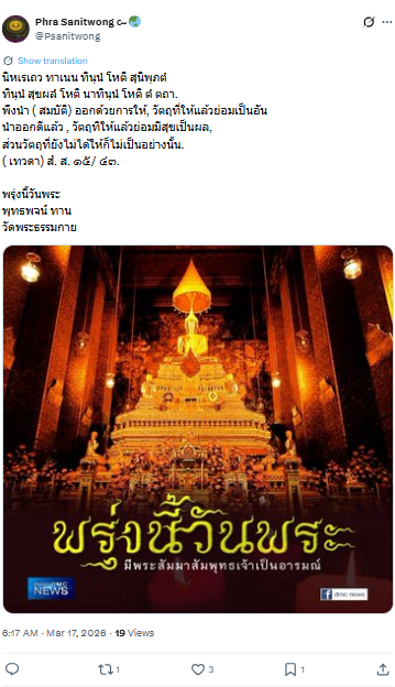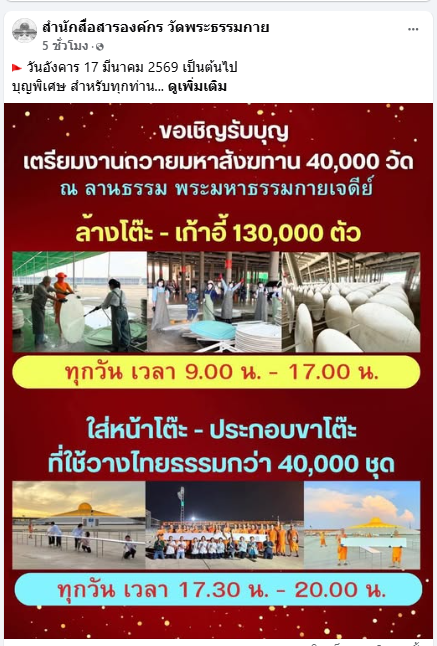 วันอังคาร 17 มีนาคม 2569 เป็นต้นไป บุญพิเศษ สำหรับทุกท่าน เพื่อเตรียมงานวันคุ้มครองโลก 22 เมษายน ถวายมหาสังฆทานแด่คณะสงฆ์จาก 40,000 กว่าวัด