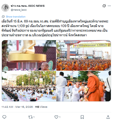 กอ.รมน.จว.สข. ร่วมพิธีทำบุญเมืองหาดใหญ่และตักบาตรพระสงฆ์จำนวน 1,109 รูป เนื่องในโอกาสครบรอบ 109 ปี เมืองหาดใหญ่