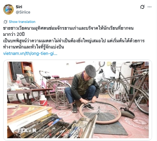 ชายชาวเวียดนามอุทิศตนซ่อมจักรยานเก่าและบริจาคให้นักเรียนที่ยากจน มากว่า 20ปี