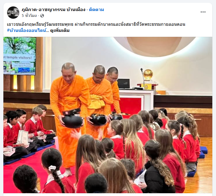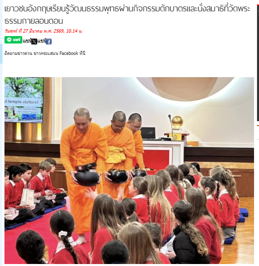 เยาวชนอังกฤษเรียนรู้วัฒนธรรมพุทธผ่านกิจกรรมตักบาตรและนั่งสมาธิที่วัดพระธรรมกายลอนดอน