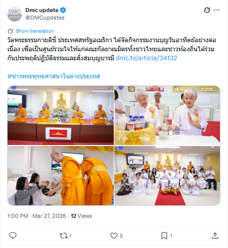วัดพระธรรมกายดีซี จัดกิจกรรมงานบุญ เพื่อเป็นศูนย์รวมใจให้แก่ชาวไทยและชาวท้องถิ่นได้ประพฤติปฏิบัติธรรมและสั่งสมบุญบารมี