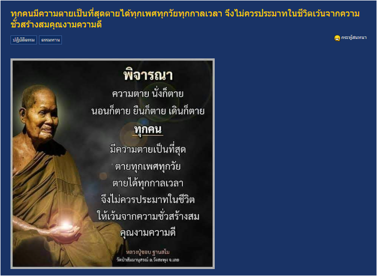 ทุกคนมีความตายเป็นที่สุดตายได้ทุกเพศทุกวัยทุกกาลเวลา จึงไม่ควรประมาทในชีวิตเว้นจากความชั่วสร้างสมคุณงามความดี