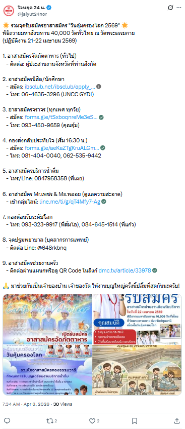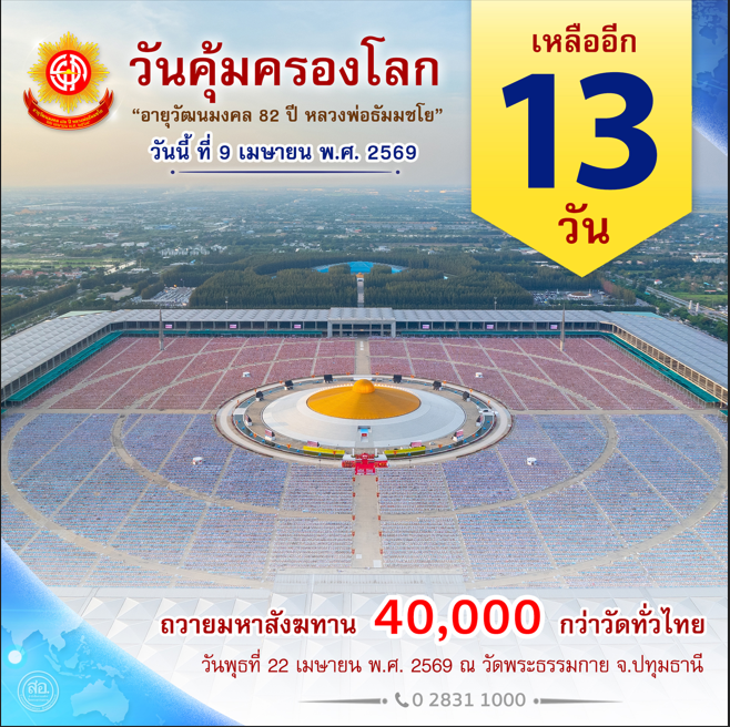 รวมจุดรับสมัครอาสาสมัคร วันคุ้มครองโลก 2569 พิธีถวายมหาสังฆทาน 40,000 วัดทั่วไทย ณ วัดพระธรรมกาย (ปฏิบัติงาน 21-22 เมษายน 2569)