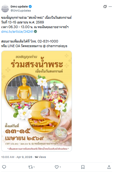 ขอเชิญทุกท่านร่วม สรงน้ำพระ เนื่องในวันสงกรานต์ วันที่ 13-15 เมษายน พ.ศ. 2569 เวลา 06.30 - 13.00 น. ณ หอฉันคุณยายอาจารย์ฯ