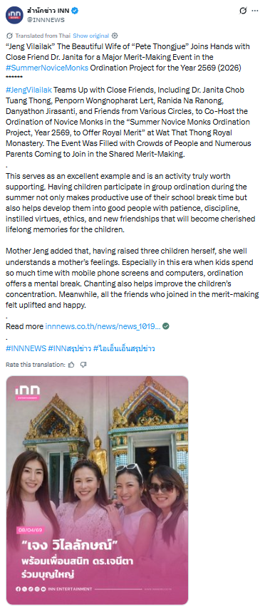 เจง วิไลลักษณ์ พร้อมเพื่อนสนิท ดร.เจนีตา ร่วมบุญใหญ่โครงการบรรพชา สามเณรภาคฤดูร้อน ประจำปี 2569 ณ วัดธาตุทอง พระอารามหลวง