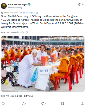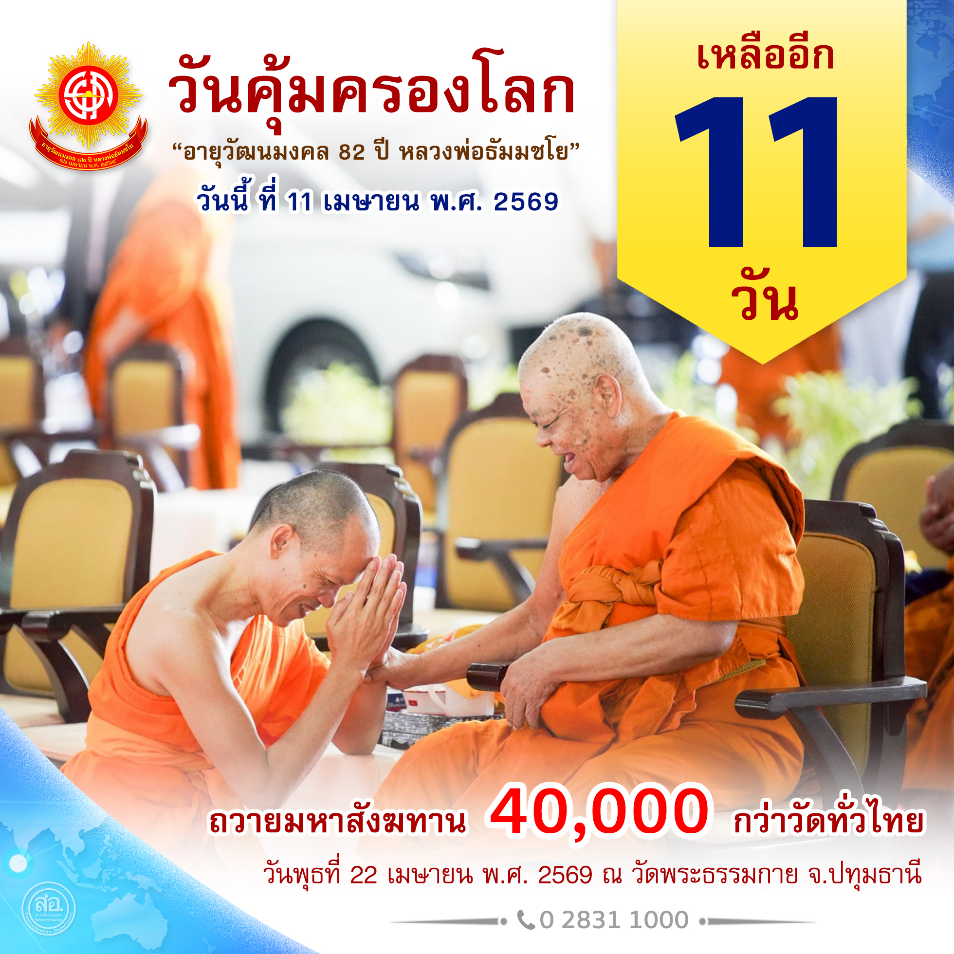 ญใหญ่ ! พิธีถวายมหาสังฆทาน 40,000 วัดทั่วไทย ฉลองอายุวัฒนมงคล 82 ปี หลวงพ่อธัมมชโย วันคุ้มครองโลก 22 เมษายน พ.ศ. 2569 วัดพระธรรมกาย