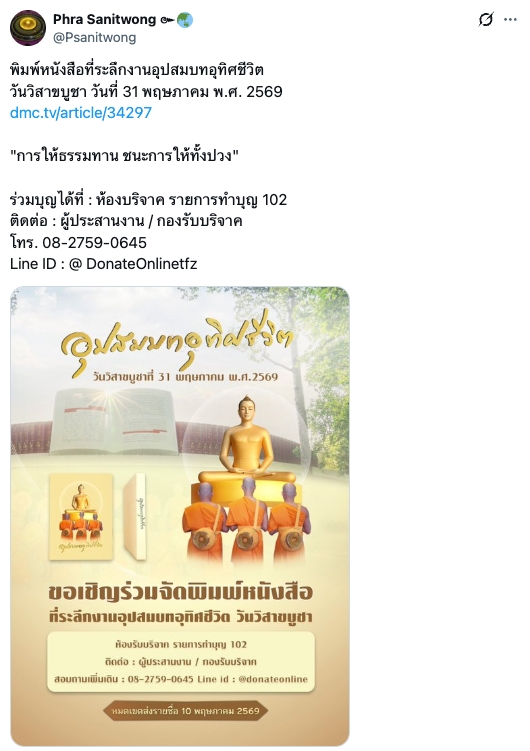 พิมพ์หนังสือที่ระลึกงานอุปสมบทอุทิศชีวิต วันวิสาขบูชา วันที่ 31 พฤษภาคม พ.ศ. 2569