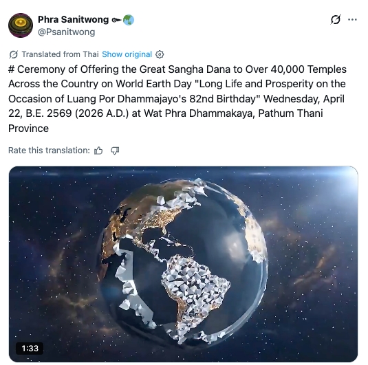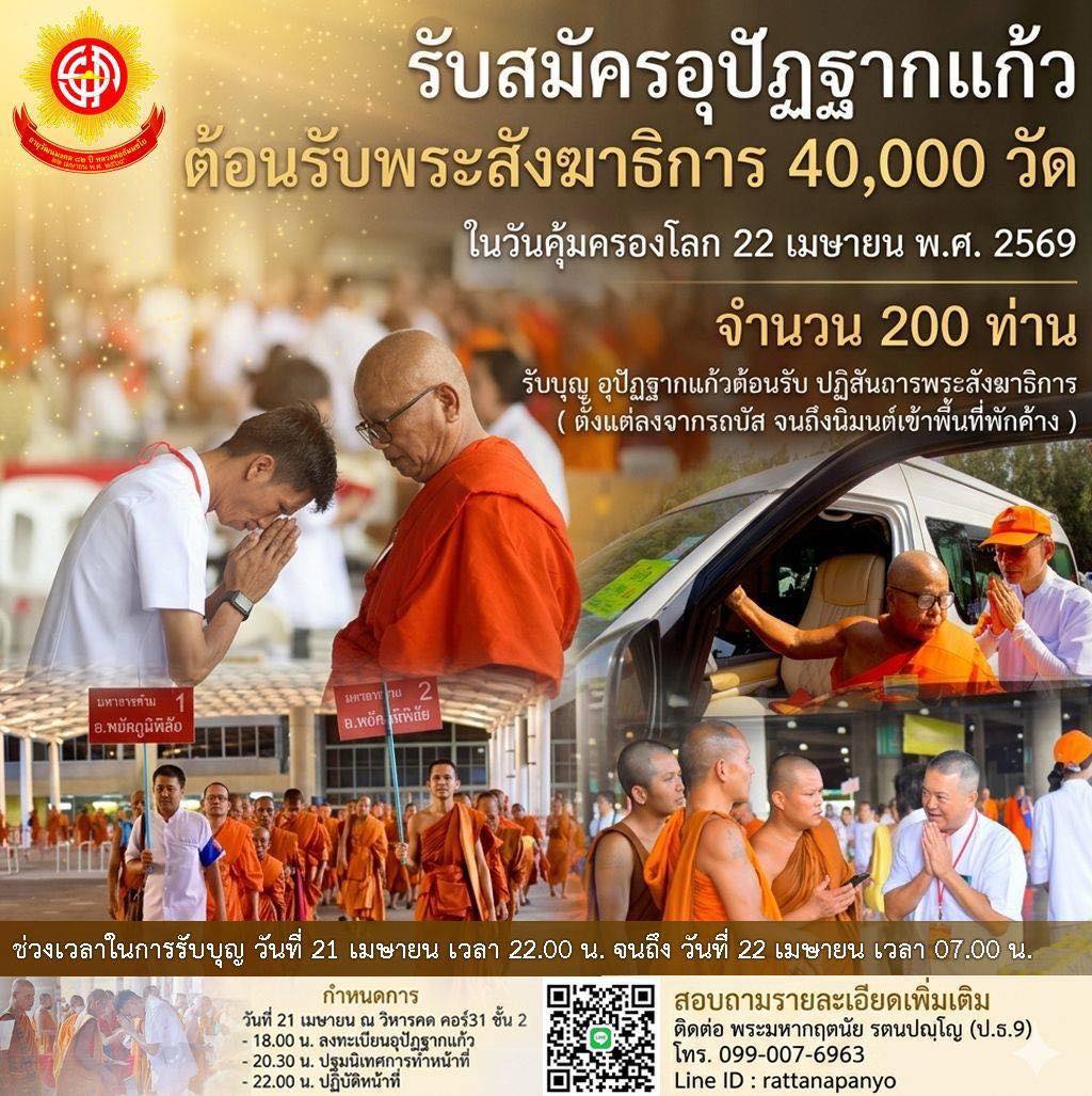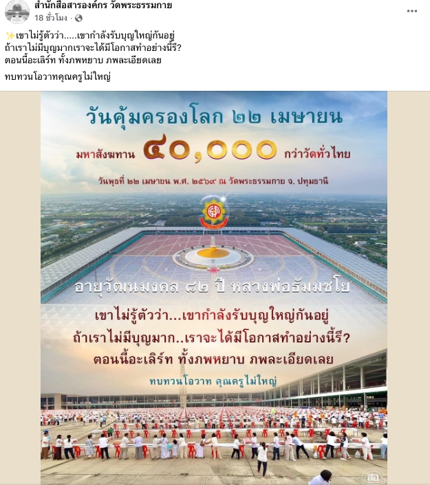 พิธีถวายมหาสังฆทาน 40,000 กว่าวัดทั่วประเทศ เนื่องในวันคุ้มครองโลกอายุวัฒนมงคล 82 ปี หลวงพ่อธัมมชโย" วันพุธที่ 22 เมษายน พ.ศ. 2569 ณ วัดพระธรรมกาย จ.ปทุมธานี