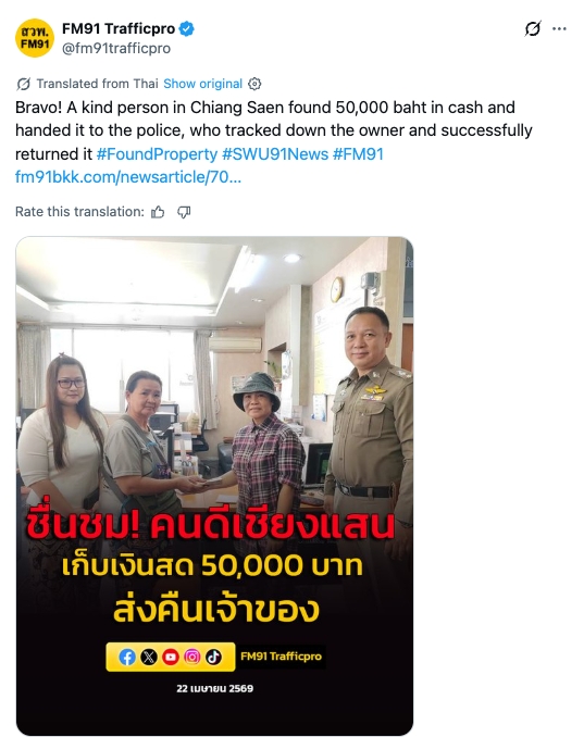 ชื่นชม! คนดีเชียงแสน เก็บเงินสดได้ 50,000 บาท ส่งตำรวจตามหาจนคืนเจ้าของสำเร็จ
