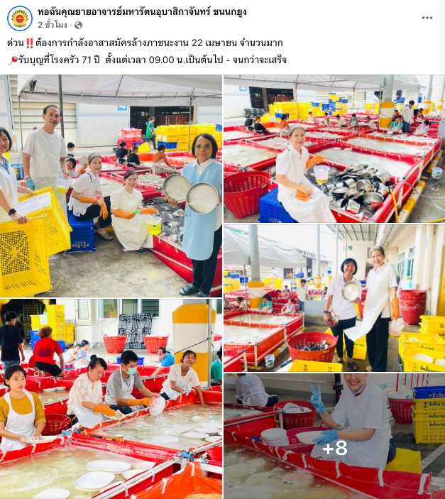 ด่วนต้องการกำลังอาสาสมัครล้างภาชนะงาน 22 เมษายน จำนวนมาก รับบุญที่โรงครัว 71 ปี ตั้งแต่เวลา 09.00 น.เป็นต้นไป - จนกว่าจะเสร็จ