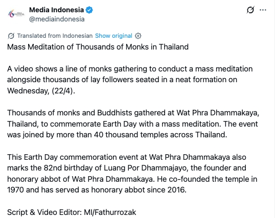 พระภิกษุสงฆ์สงฆ์จำนวนมากในประเทศไทยนั่งสมาธิเจริญภาวนาร่วมกันในวันคุ้มครองโลก