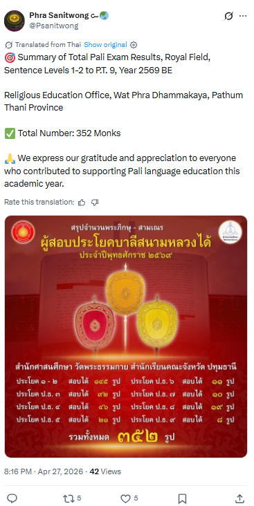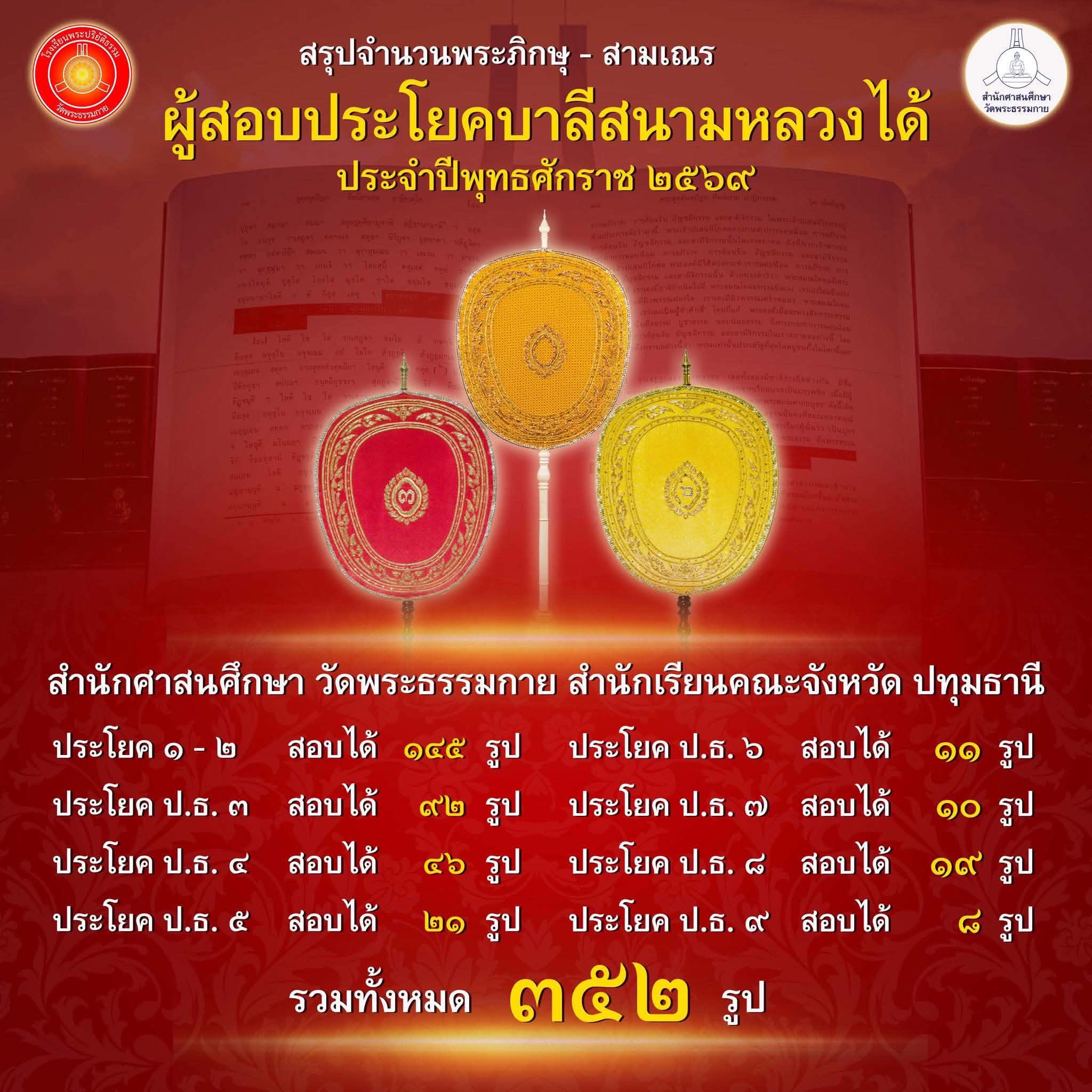 สรุปรวมยอดสอบบาลีสนามหลวง ชั้นประโยค ๑-๒ ถึง ป.ธ.๙ ปี พ.ศ. ๒๕๖๙ สำนักศาสนศึกษา วัดพระธรรมกาย จังหวัดปทุมธานี